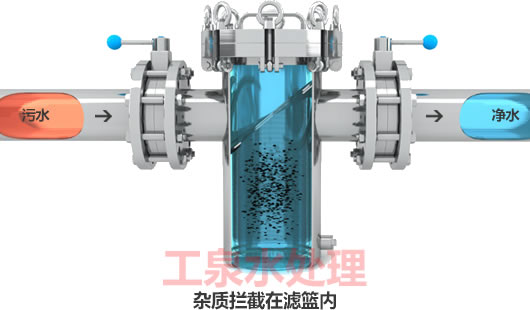 毛發(fā)過濾器工作時,介質(zhì)由進(jìn)口進(jìn)入濾網(wǎng)內(nèi)側(cè),經(jīng)濾網(wǎng)過濾后進(jìn)入濾網(wǎng)外側(cè),經(jīng)出口進(jìn)入管路系統(tǒng)。當(dāng)毛發(fā)過濾器使用一定時間后由于污物的堵塞書的阻力增大,這時就需要打開過濾器的封蓋,取出里面的濾筒清洗干凈,然后再繼續(xù)使用。