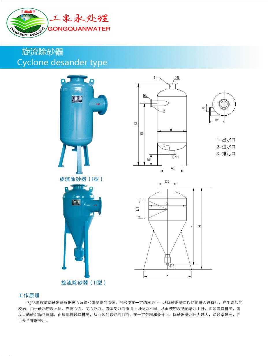 旋流除砂器的工作原理: 旋流除沙器是利用離心分離的原理進(jìn)行除沙,由于進(jìn)水管安裝在筒體的偏心位置,當(dāng)水通過旋流除沙器進(jìn)水管后,首先沿筒體的周圍切線方向形成斜向下的周圍流體,水流旋轉(zhuǎn)著向下推移,當(dāng)水流達(dá)到錐體某部位后,轉(zhuǎn)而沿筒體軸心向上旋轉(zhuǎn),最后經(jīng)出水管排出,雜污在流體慣性離心力和自身重力作用下,沿錐體壁面落入設(shè)備下部錐形渣斗中,錐體下部設(shè)有構(gòu)件防止雜物向上泛起,當(dāng)積累在渣斗中的雜物到一定程度時,只要開啟手動蝶閥,雜物即可在水流作用下流出旋流除沙器。 旋流除砂器是根據(jù)離心沉降和密度差的原理,當(dāng)水流在一定的壓力下從除砂進(jìn)水口以切向進(jìn)入設(shè)備后,產(chǎn)生強(qiáng)烈的旋轉(zhuǎn)運(yùn)動,由于砂和水密度不同,在離心力、向心力、浮力和流體曳力的共同作用下,使密度低的水上升,由出水口排出,密度大的砂粒由設(shè)備底部的排污口排出,從而達(dá)到除砂的目的。